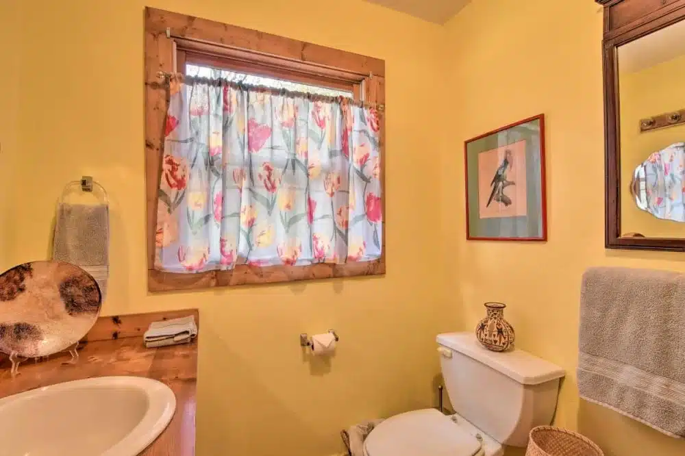 The cabin has the fundamentals for a cozy and relaxing stay. It features a twin daybed with a twin trundle and a pull-out bed, so the layout stays open but still gives you places to sleep. Wall-to-wall picture windows pull in sunlight and give you a perfect view of the mountains from inside.