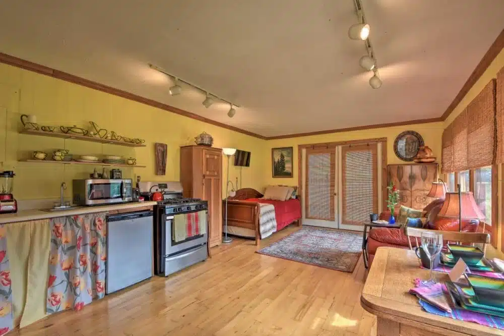 If you’ve been dreaming of a quiet Smoky Mountain getaway, then this cozy cabin in Brasstown, North Carolina might be exactly what you need. Hidden away on a large piece of land just outside town, the 600-square-foot studio cabin not only gives you peace and privacy, but also delivers that simple “back to nature” feeling people crave when they’re ready to escape busy life.