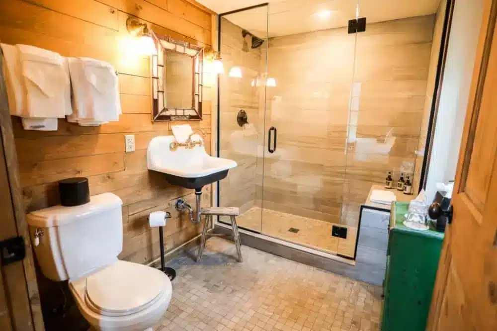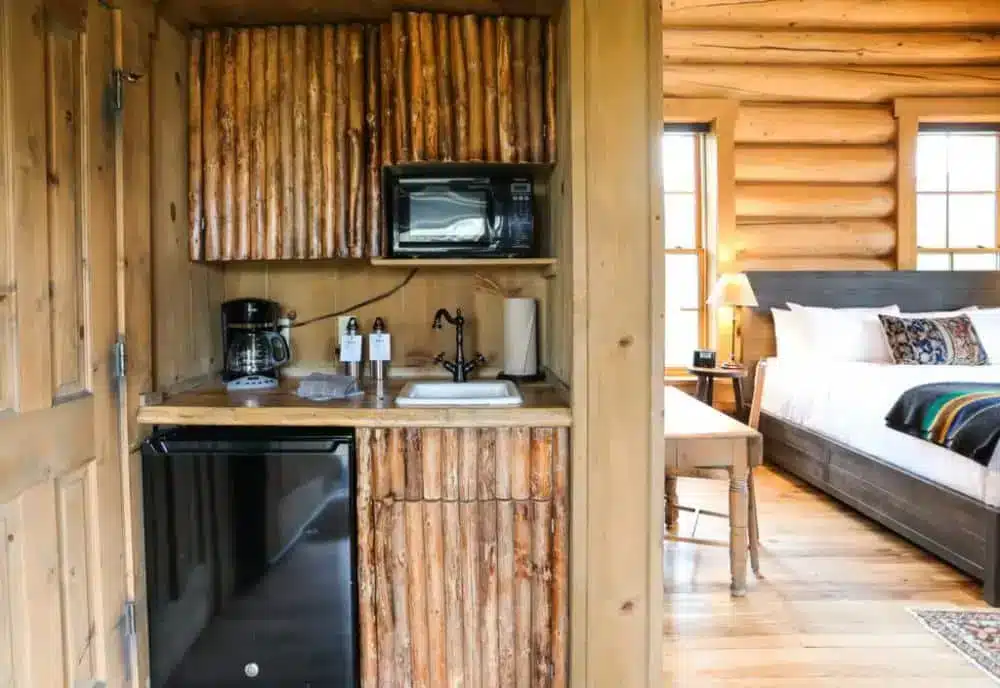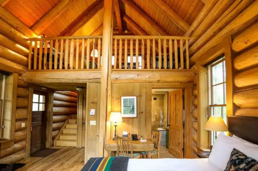 Inside, you get the kind of setup people imagine when they think “mountain cabin.” There’s a wood-burning fireplace, warm lighting, thoughtful artwork, and rustic furniture that makes the whole place feel both stylish and homey. Depending on which cabin you get at check-in, you’ll either have a king bed in the main living area or a queen bed on the first floor with an extra bed upstairs in the loft. Cabins with lofts offer even more sleeping space, which is nice if you want to stretch out or bring a teen or friend.