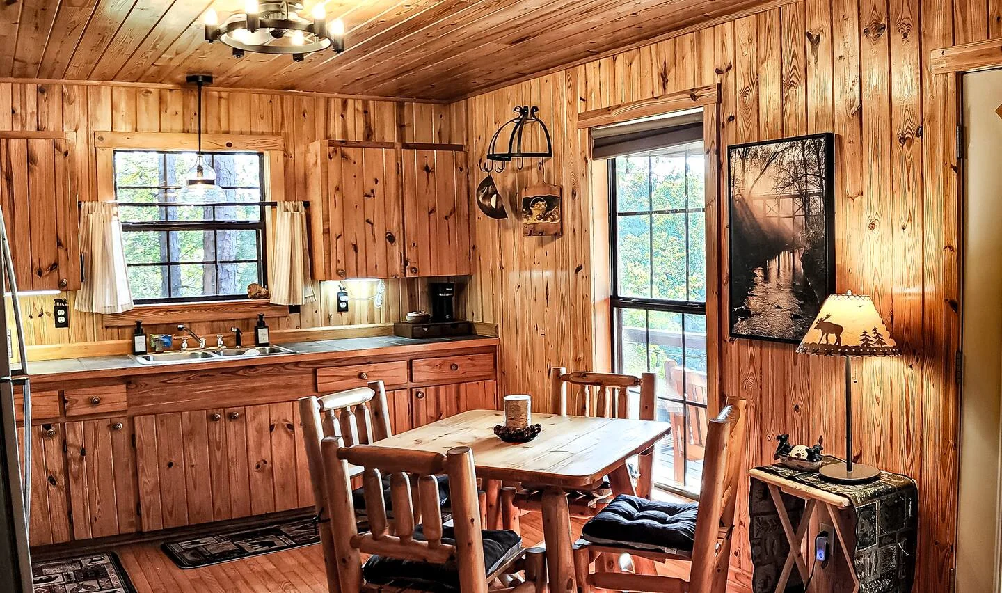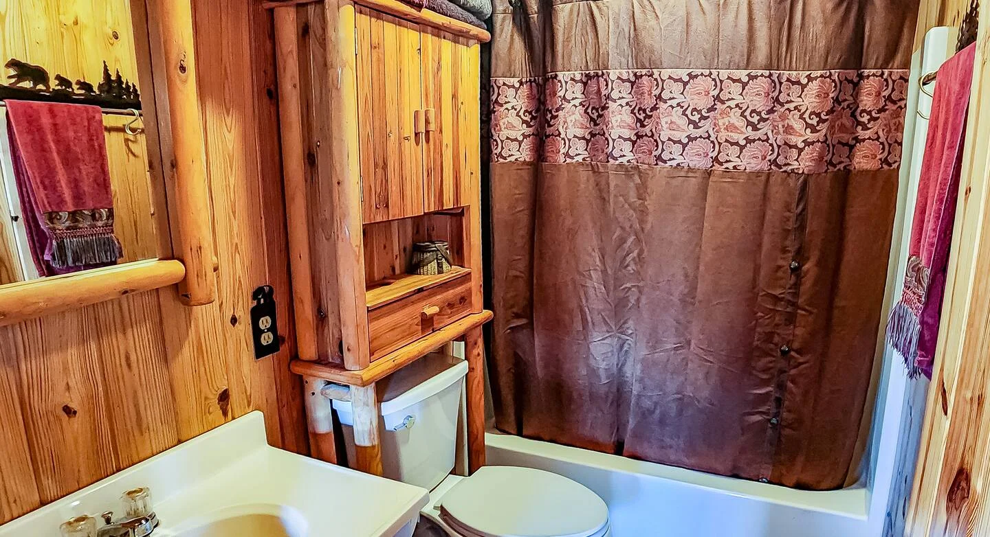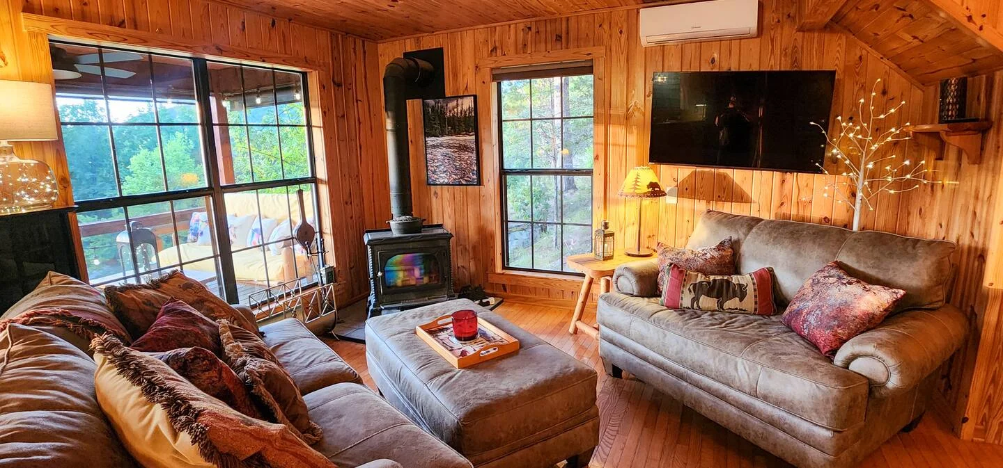 Inside, the cabin is just as inviting as the scenery outside. The space blends rustic touches—like exposed wood beams and stone accents—with all the modern comforts you need for a relaxing stay.