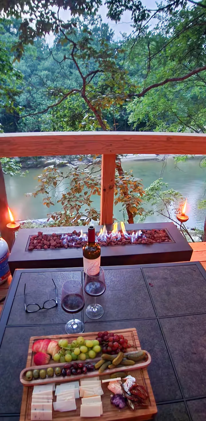 When it comes to romantic cabin rental it means having three decks that not only offer something unique but also have unmatched features. The main back deck gives you a view of the waterfalls, the creek below, and of course the nature around it all. On the upper floor there is another private deck with a gas fireplace, ideal for stargazing or getting cuddly under a blanket on chilly nights. The lower deck is a nook surrounded by trees that provides intimacy—great for quiet mornings or late-night conversations by the fire.