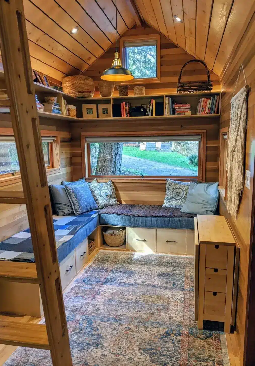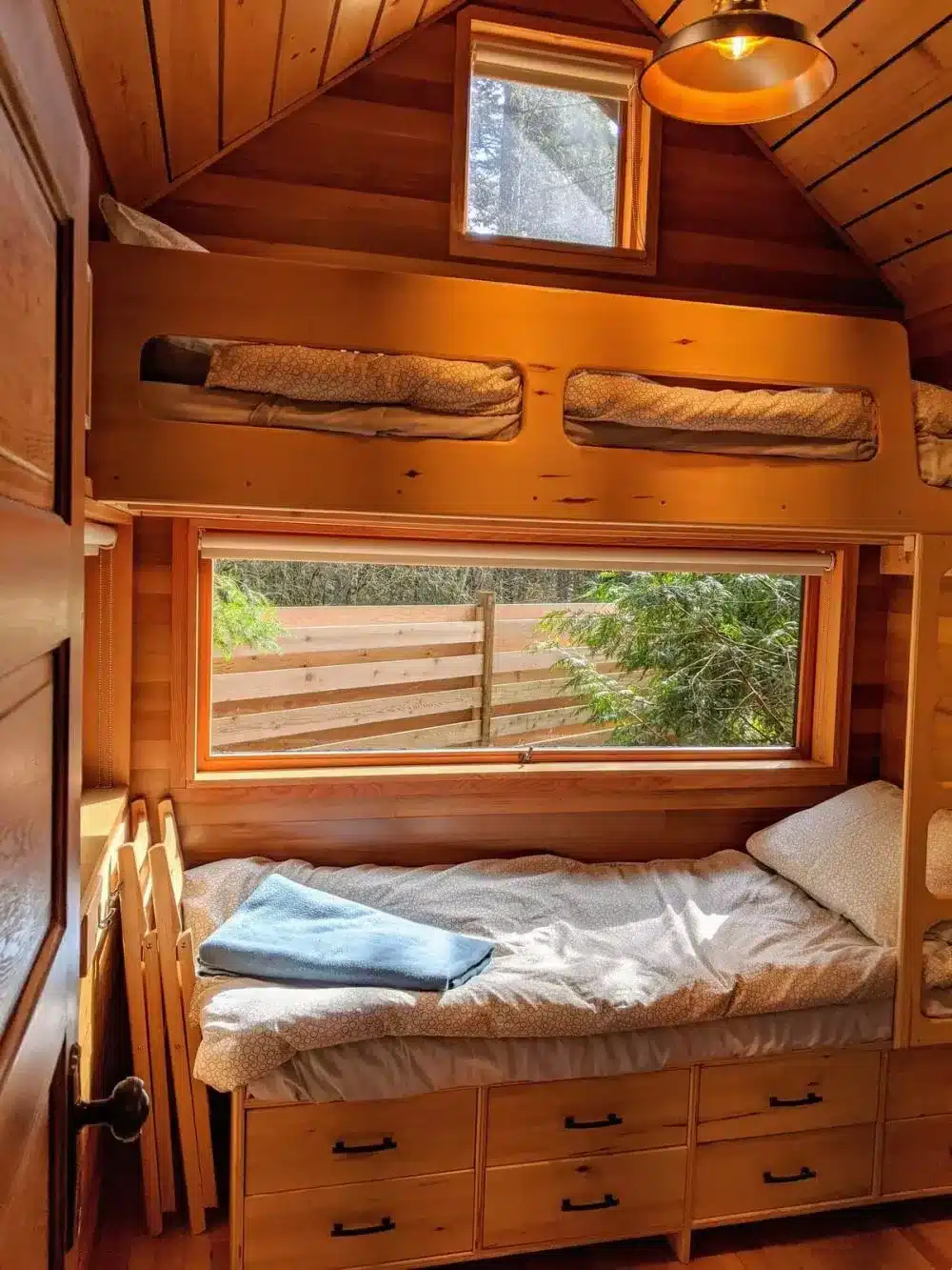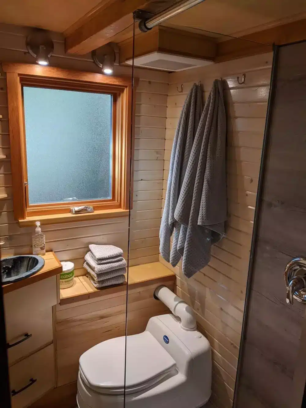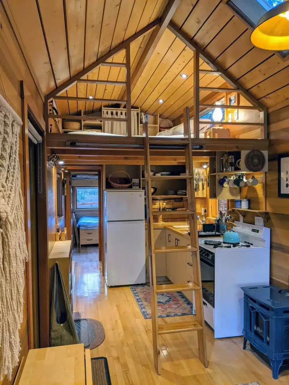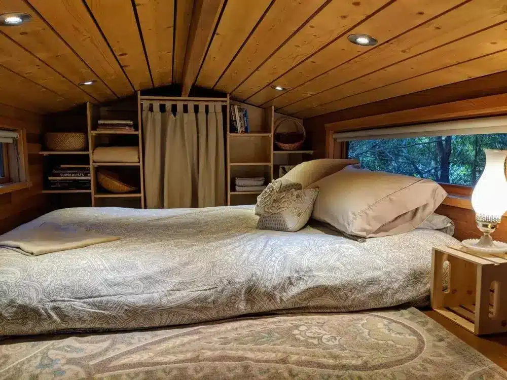 Because it’s a tiny home, the shower, doorways, and some spaces are a bit narrow. Taller guests might need to duck now and then — part of the charm of small living.