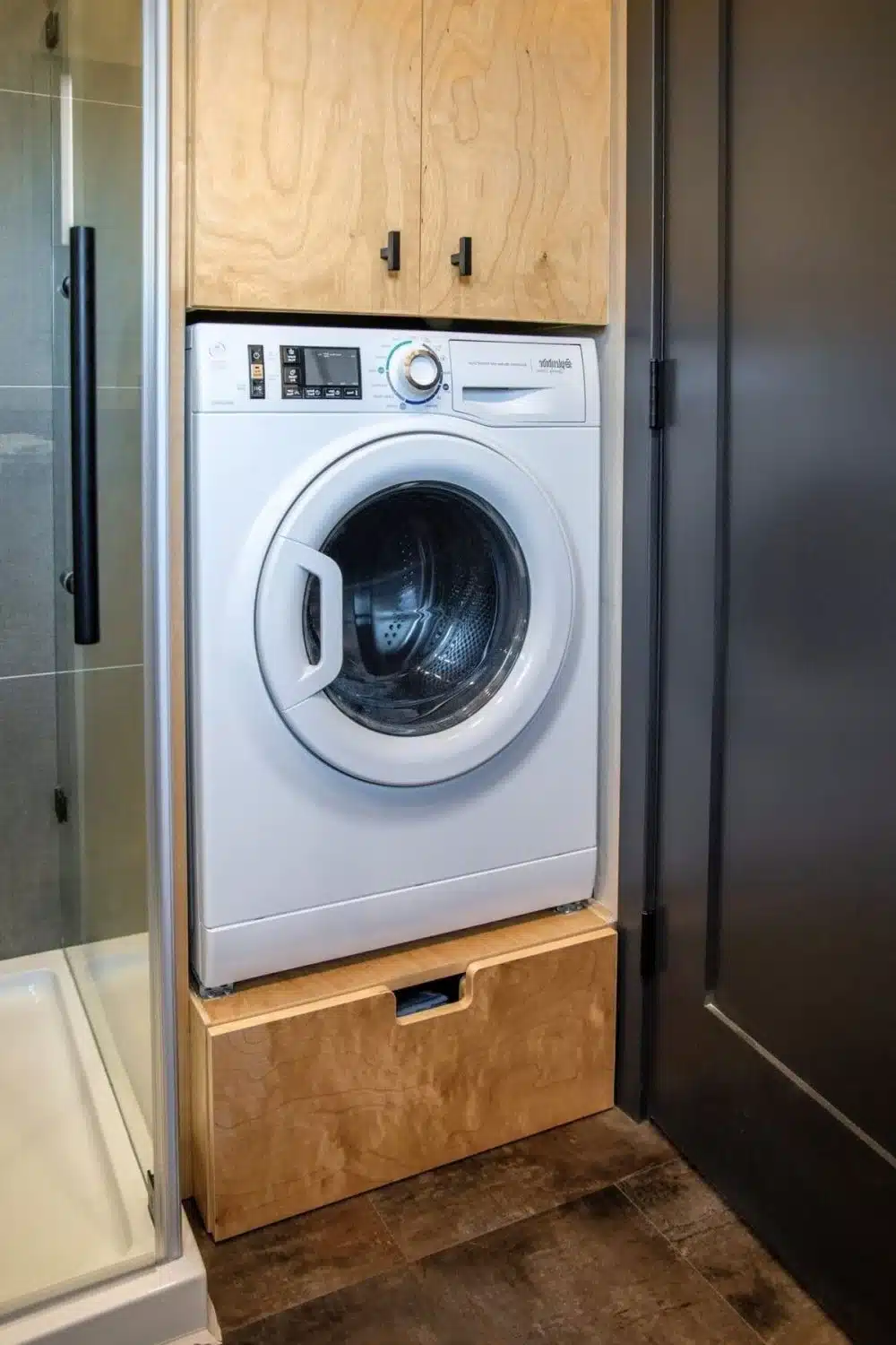 Next to the shower, there’s also a washer-dryer combo unit built into custom cabinetry with extra storage above and below.