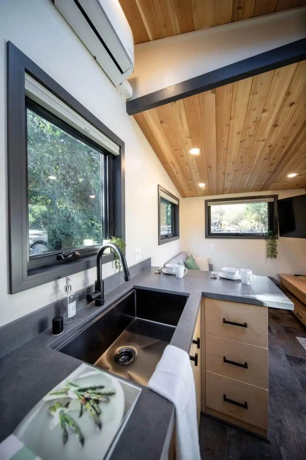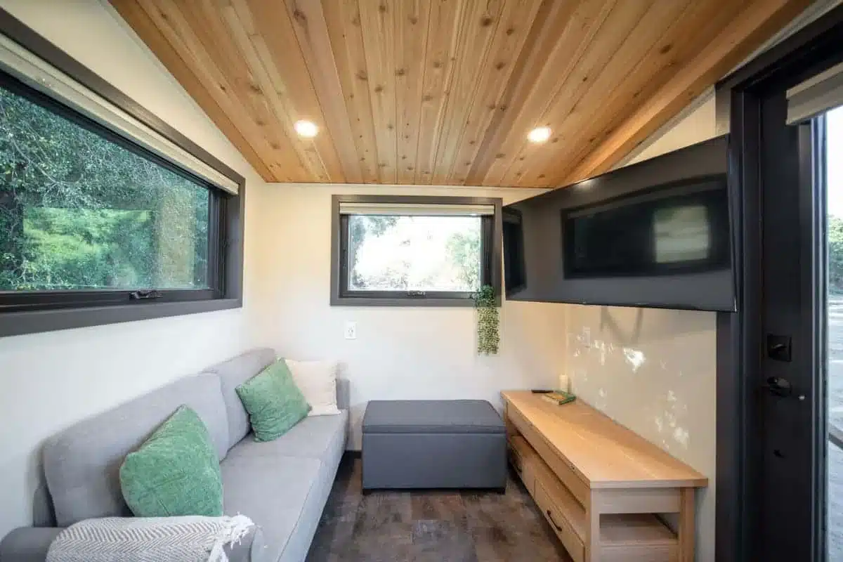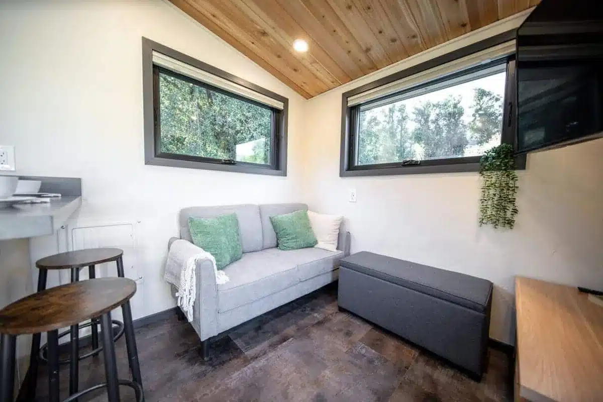 The first thing you see when entering the Adagio tiny house shows how the entire interior space contains bright illumination. The large windows enable natural sunlight to enter the room which creates an effect that expands the space and makes it more inviting.