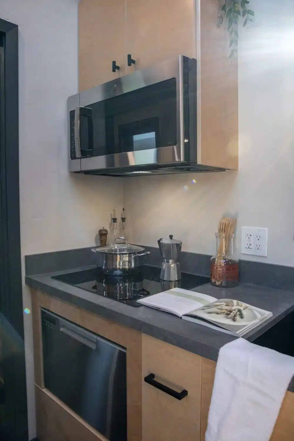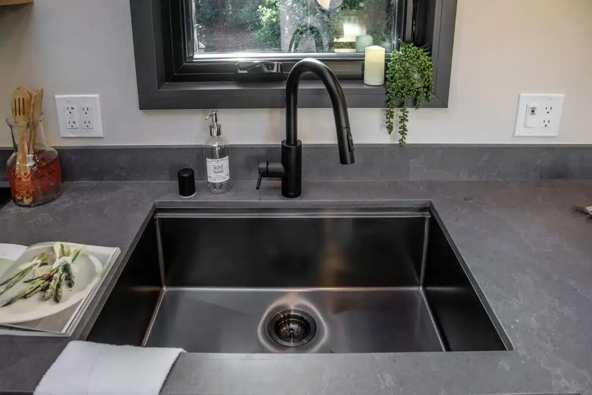The Adagio kitchen is one of the highlights of the home. Instead of shrinking everything down like many tiny houses do, Piccola Tiny Homes designed a kitchen that works much like the one you’d find in a small apartment.