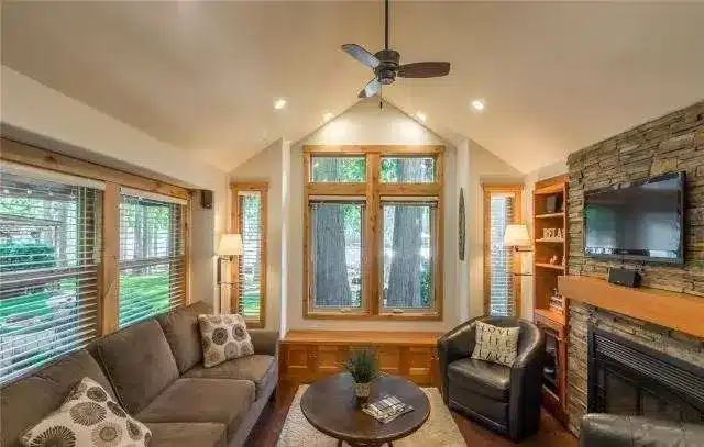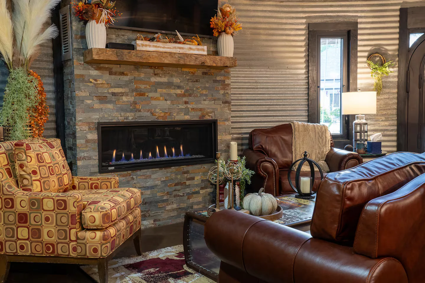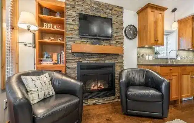 Step inside and the first thing that hits you is the warm, welcoming living room. The stone fireplace instantly gives the space soul. Picture yourself wrapped in a blanket with a mug of coffee, watching the flames dance. The room feels open and bright thanks to large front windows that pull in natural light. If you like a good porch moment, there’s an outdoor space right up front where you can sit in the sun, read, or just breathe.