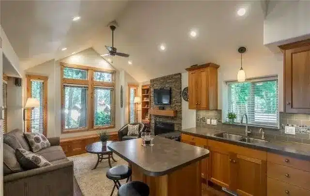 There’s a kitchen island with stools that adds extra counter space while also doubling as a breakfast spot. Imagine pouring your morning coffee or sitting here with a quick snack after coming in from the porch. Whether you like simple meals or actually enjoy cooking, this kitchen won’t get in your way.