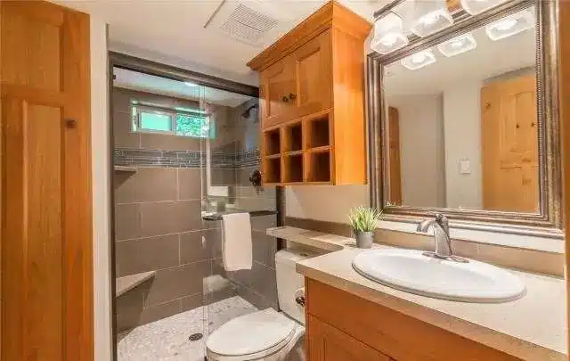 Just a few steps from the bedroom is the bathroom, built with the same “simple but high quality” mindset. The vanity gives you enough room for everyday essentials without swallowing space. But the real highlight is the walk-in shower with tiled floors and a glass enclosure. It feels clean, bright, and more luxurious than you’d expect in a tiny house.