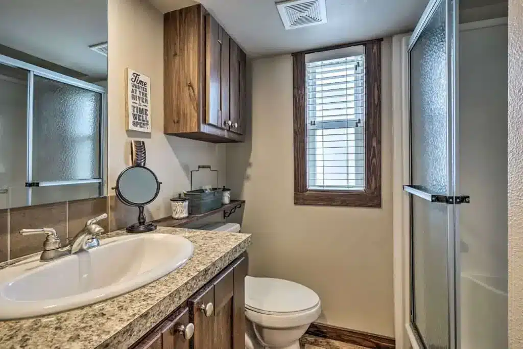 There’s also more storage than most full-size bathrooms have, which keeps everything neat without cluttering up the room. The stone accents carry the rustic theme throughout the house and add texture and warmth.