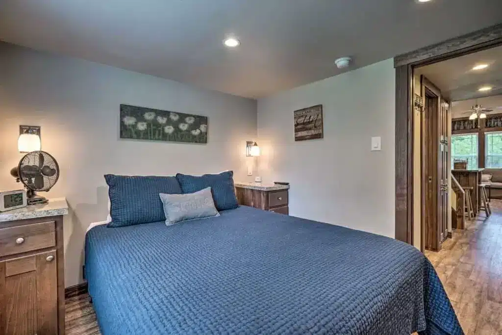 When you first walk in, you land right in the living room — and it instantly sets the tone. A stone fireplace anchors the space with a cozy, earthy vibe. There’s room for sofas and chairs, so you’re not cramming yourself into a corner or sacrificing comfort. It feels like a place where you could actually sit down, breathe, and have a real conversation.